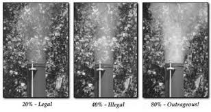 This includes garbage, treated wood, paper (except for starting the fire), and plastics. For a complete list of prohibited materials, please refer to Washington Administrative Code 173-433-120. Watch your chimney smoke. Generating excessive smoke is not only un-neighborly, it's illegal. Under state regulations, smoke from your chimney cannot exceed 20 percent opacity (as shown in the left panel in the image to the right) for six consecutive minutes in any one-hour period. Greater smoke densities could result in fines from air pollution control officials. It is always illegal to smoke out your neighbor. Everyone has a right to breathe clean air. If smoke from your fire is affecting your neighbors, it is considered a nuisance and subject to enforcement action (Regulation 1, Section 9.11, PDF). TIP: To help minimize smoke, burn small, hot fires and give the fire plenty of air. Check your chimney occasionally: If you see smoke coming out, you are not burning hot enough and are wasting fuel.