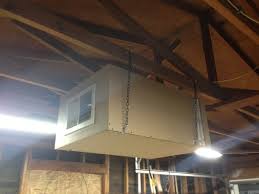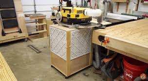 The motor slid in place as planned and we secured it on the top side of the housing with a couple of screws into the exit side panel. Before adding the last piece we loaded it up with filters to get a final check of the intake side. We went with three filters for the intake to reduce the work load of each filter. The two outer filters should catch the larger stuff and the intake filter closest to the blower was the highest rated filter to remove the smaller particles. The last piece to be installed was the front panel. This will be the side facing the middle of Shawn’s shop when installed. Once installed, the unit will be close to the ceiling so removing the top for maintenance would not be possible. For that reason we chose to construct the box in such a way that the front and back were attached to the top and bottom. That way the front panel can be removed easily with a few screws. And speaking of it being installed, Shawn put together an installation video for those who want to see it mounted in his shop.