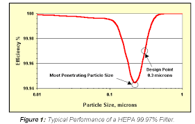 true HEPA filter in contrast with a near HEPA filter, must remove 99.97% of all generally are considered to have efficiencies at 0.3 microns of less than 99.97% but greater than 90%. In the theory of air cleaning a 0.3 micron size particle is near the most difficult size particle to filter from the air. It is intuitive to see that 0.3 micron particles are more difficult to filter than larger particles. But, intuition is contradicted by the fact that 0.3 micron particles are actually more difficult to filter than smaller particles1. As particles become very small, the effects of Brownian motion allow the particles to impact on filter fibers not in the most direct path to the exhaust side of the filter. When particles become extremely small compared to 0.3 microns this rule breaks down and the particles may no longer be filtered from the air. In this case, another process called adsorption is used to remove