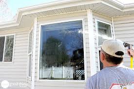 It was new to us, and it sounded much too easy.So we tried it (or should I say Randy tried it) over the weekend. Randy set out just to test a few windows and the next thing I knew he had worked clear around the house, and was already working on some of the upstairs windows as well. There was an immediate difference, and so much easier than what we had tried in the past.It was so bright inside we had to wear shades.The Best Homemade Window Cleaner:The proportions:2 cups water 1/4 cup white vinegar 1/2 teaspoon dish detergentWhat you’ll need:a bucket scrub brush with optional, extension pole water hose with optional sprayer attachmentWhat Randy did:For starters, he made a whole bucket of the solution. Using a soft bristle scrub brush on an extension pole handle thingy, dip the brush in a bucket of the solution, and scrub it on the window. Before it has a chance to dry, spray/rinse it off with clean water. Be sure to rinse thoroughly. A hose fitted with a sprayer attachment was helpful.Notes: The solution could be made and used in a spray bottle, but we found working on lots of windows, the bucket and scrub brush worked great.